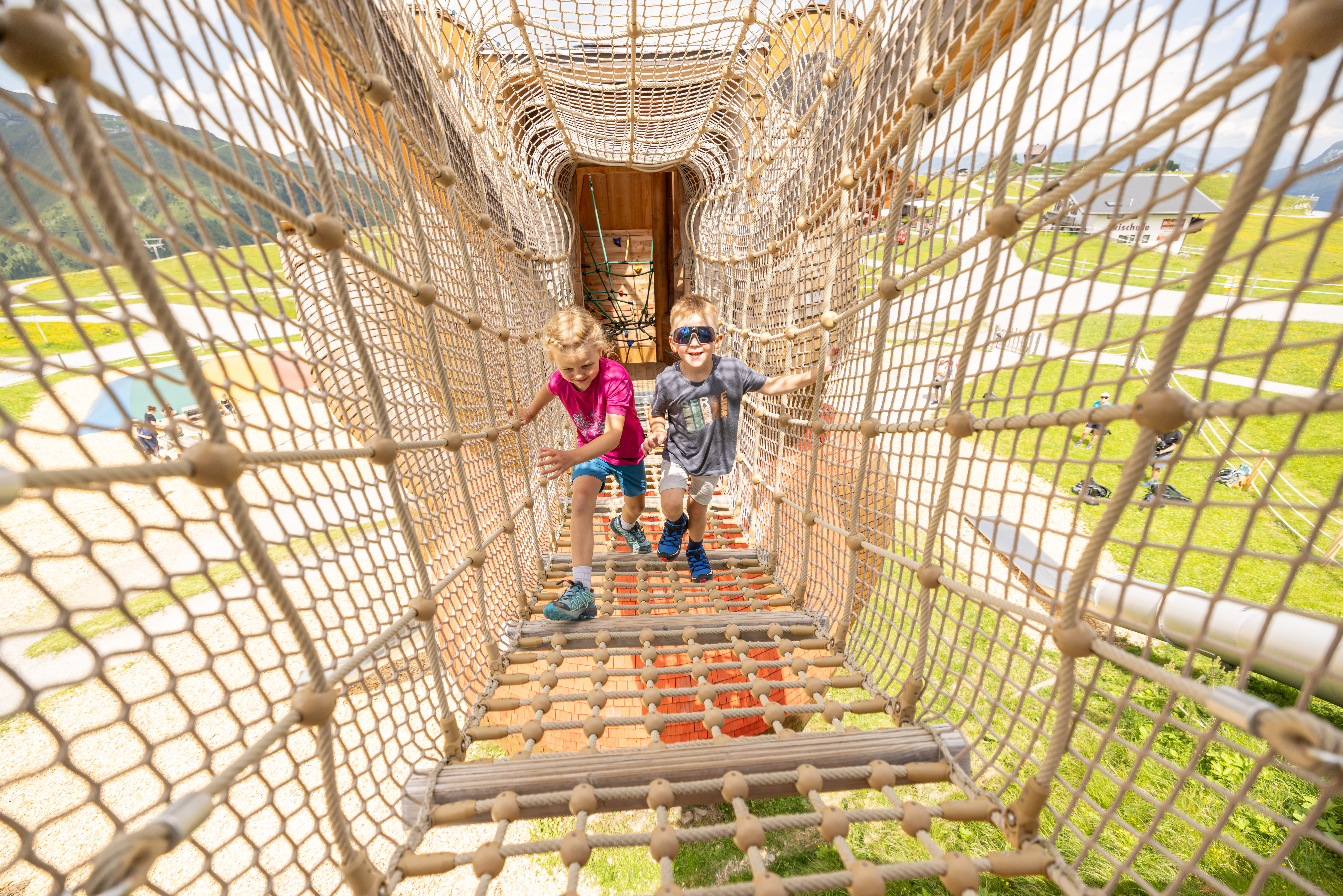 Behind the giant bear Pepi two towers are built which can be reached by hanging bridges. It takes some courage to march in dizzying heights over the bridges and is just the thing for small and big adventurers. About 7 m above the ground, it's off the second tower with a 15 m slide. When you slide it tingles neatly in the stomach and makes you want more.